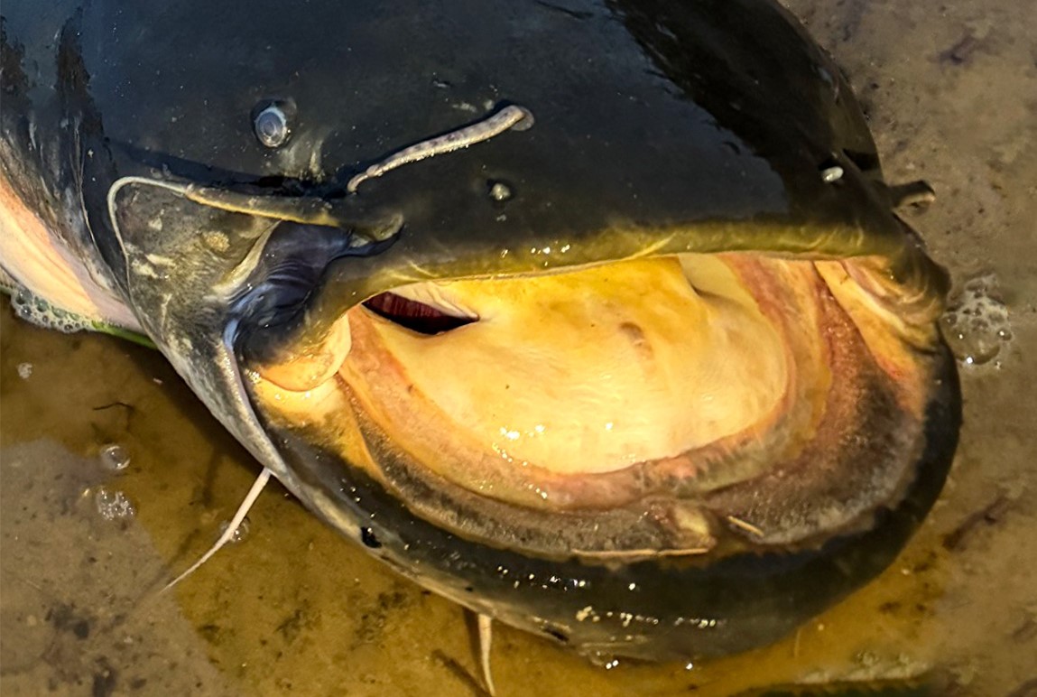 Из воды гиганта вытаскивали вдвоём: подтянуть к берегу удалось лишь после нескольких попыток. Сом клюнул на 5,5-дюймовый слаг в расцветке «арбуз», оснащённый 22-граммовой чебурашкой и шнуром 0,18 мм.