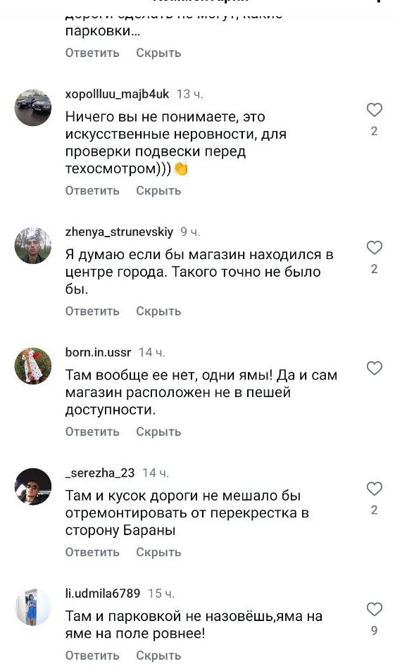 «Эта территория используется покупателями как место для парковки, но состояние её оставляет желать лучшего. Речь идет об огромных ямах и выбоинах, которые расползлись по всей парковке. Обойти или объехать их стало практически невозможным – глубина достаточно внушительная. В тёмное время суток они и вовсе не заметны. Поездка за покупками может обернуться непредвиденным ремонтом автомобиля или, еще хуже, посещением травматолога. Люди просят благоустроить эту территорию и избавить их от неприятностей», — сообщает газета.