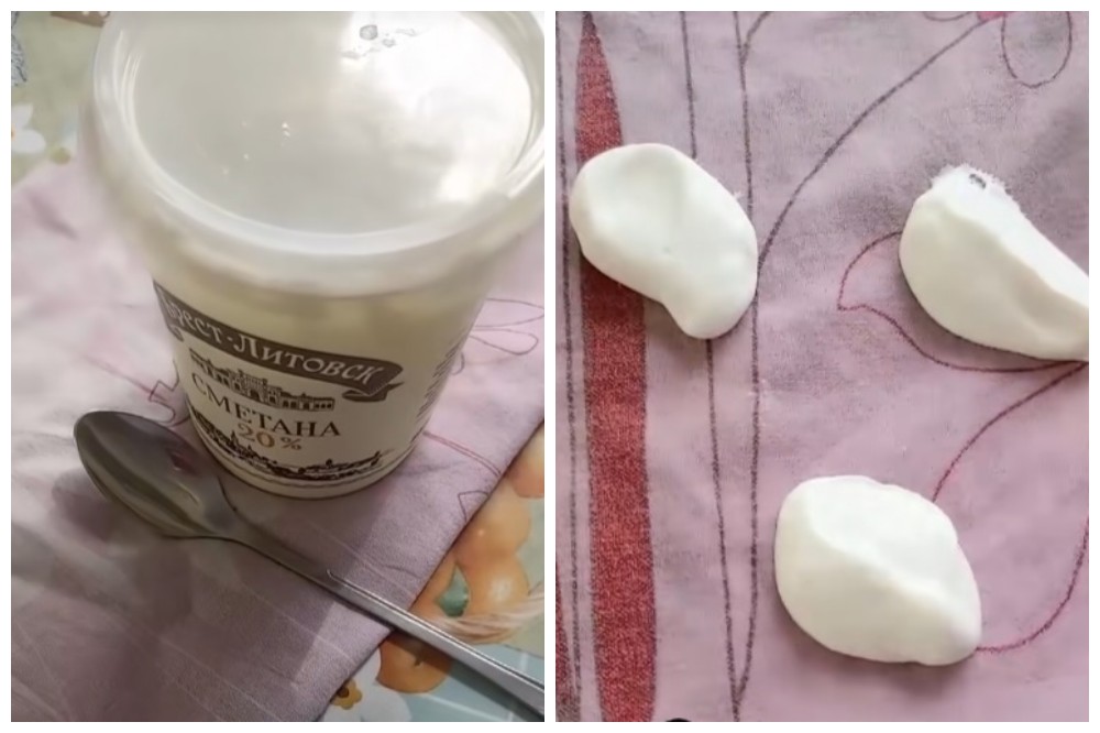 «Мне стало очень интересно, что же это за сметана такая. Я заметила, что (от неё) на маечке не было жирных пятен. Вот решила проверить», — говорит Галина на видео.