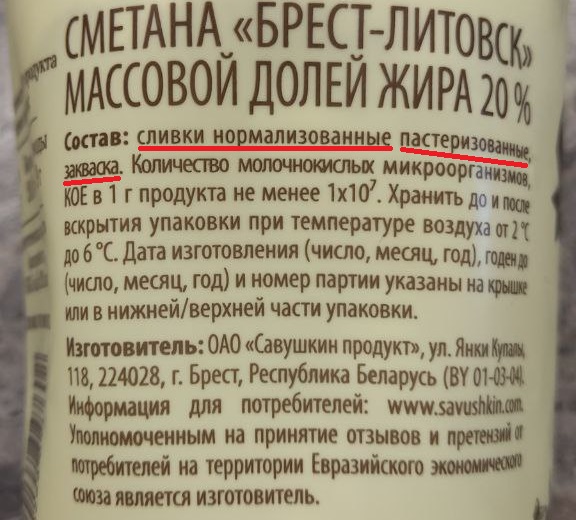 Так же, как и все другие продукты компании, сметана «Брест-Литовск» изготавливается в соответствии с требованиями законодательных технических нормативно-правовых актов ЕАС. В ее составе — только натуральные ингредиенты: нормализованные пастеризованные сливки и закваска, состоящая из молочнокислых микроорганизмов. Подробный состав продукта указан на каждой упаковке.