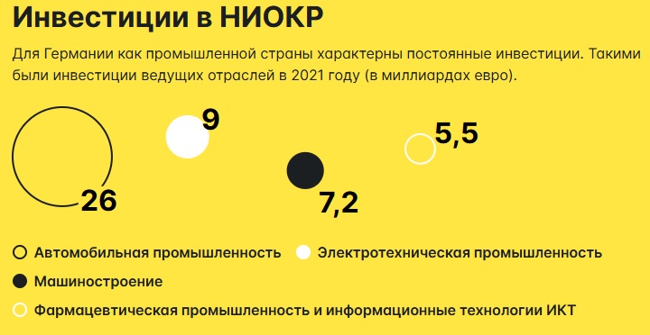 Для немецкой промышленности характерны значительные инвестиции в исследования и разработки. Ее инновационный потенциал известен всему миру. Более двух третей из трех процентов валового внутреннего продукта, которые в Германии инвестируются в научно-исследовательские и опытно-конструкторские работы (НИОКР), поступают от бизнеса.