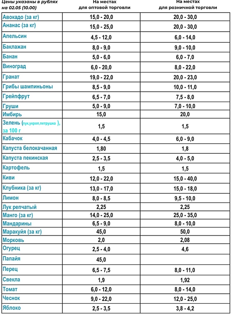 Здесь есть как розничные, так и оптовые ряды. На оптовых закупаются от ящика, соответственно и цены здесь обычно ниже. Например, клубнику уже можно купить от 13 рублей за килограмм, огурцы от 2,5 до 4,6 рублей. Даже недавно скандальные кабачки теперь есть и по 4 рубля за килограмм. Подробнее цены смотрите в таблице.
