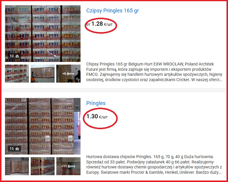 В Польше в продаже в магазинах чипсы Pringles, как правило, вдвое дешевле, чем в Беларуси. На allegro баночка по 8,71 злотых, что равно 6,96 бел рублей по курсу Нацбанка Беларуси. На мелкооптовых базах в Польше, где затариваются магазины, эти чипсы есть и по 1,28 евро за банку, что равно 4,34 бел рублей. Очевидно, что на заводе-производителе (в Польше) покупают ещё дешевле.