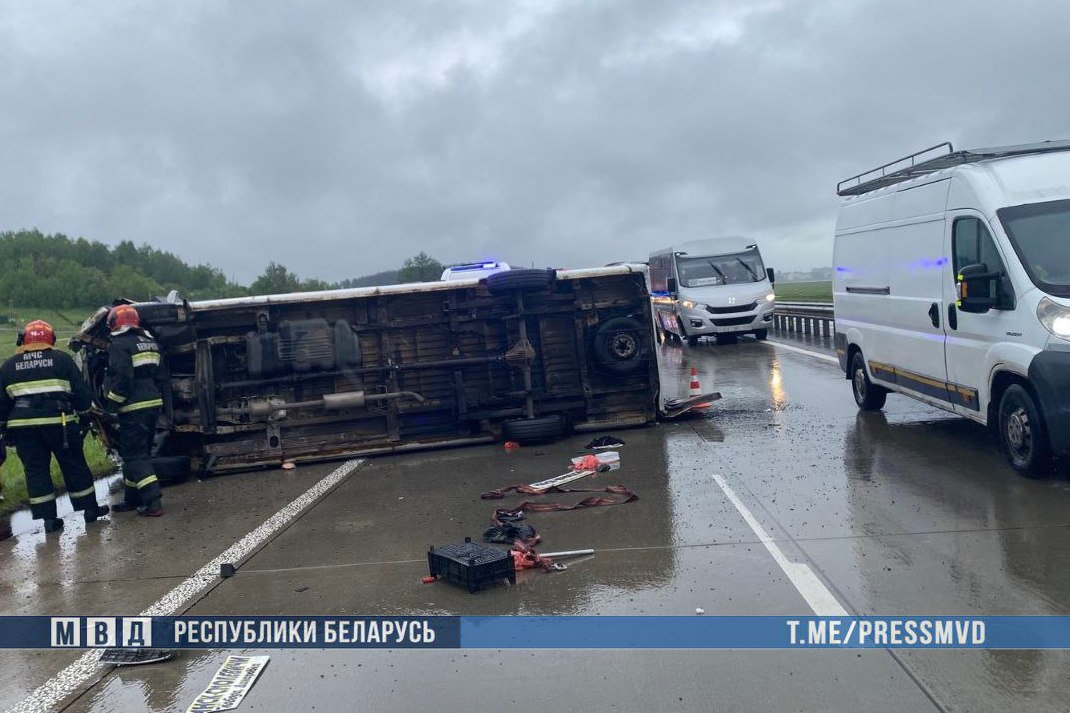 За рулём маршрутки Mercedes был 51-летний водитель. Ехал по маршруту Смолевичи-Минск. ГАИ сообщает, что предварительно, «не учел погодные условия, не справился с управлением и совершил наезд на разделительное ограждение». От этого машина упала на бок.