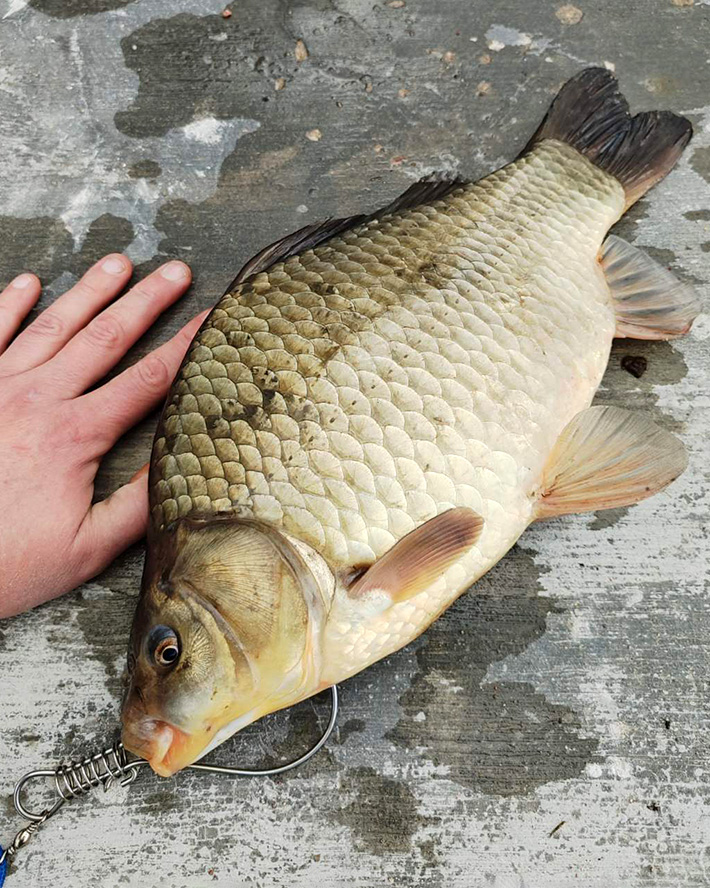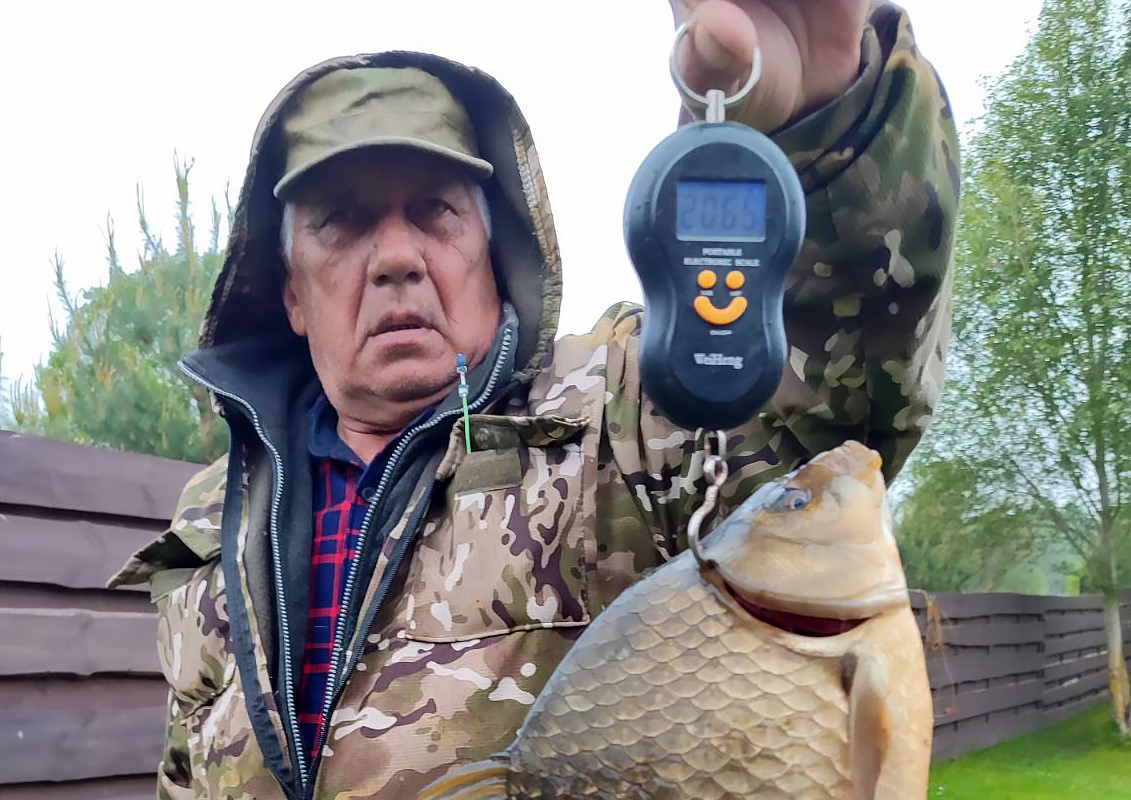 Пять опарышей, немного терпения, и вот – на крючке бешено бьётся рыба, не уступающая по характеру и силе линю. Сначала даже показалось, что это он и есть. Но через пять минут борьбы, всплесков и волнений стало ясно: перед ними серебряный карась весом более двух килограммов – точнее, 2,065 кг.