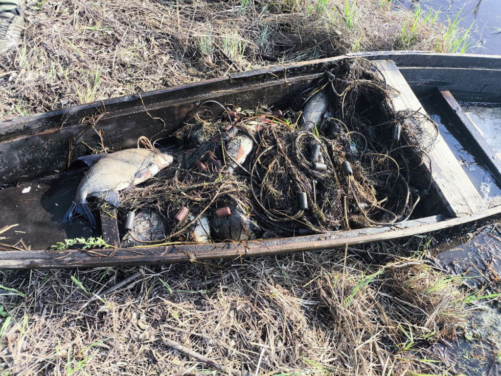 Трое мужчин на лодке расставили 280 метров лесковых сетей – четыре запрещённые снасти. В них попались более сотни рыб. Общий вес улова – около 114 килограммов.