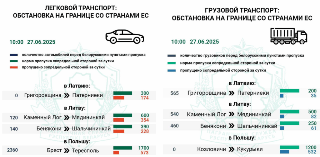 Самая напряжённая ситуация – на польском направлении. По состоянию на 10:00 въезда в Тересполь (Брест) ожидают 2 360 легковых автомобилей и 40 автобусов. За сутки польские службы оформили лишь 573 легковушки.