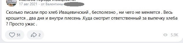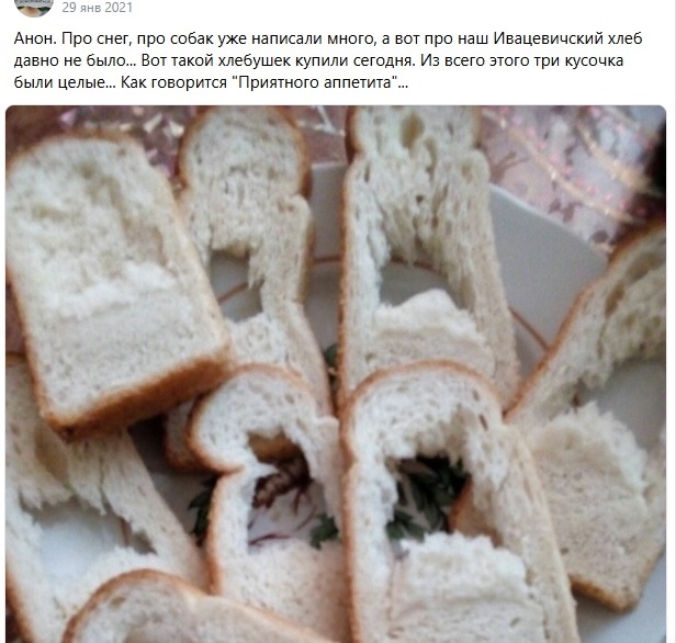 В ивацевичских чатах жалобы на хлеб были регулярно. Вот, что писал Михаил в 2024 году: «Сегодня Ивацевичский хлеб по консистенции, как глина, хоть коники лепи. Что у них там на производстве за контроль качества? Бывает спекут хороший, но это как правило редкость (в последнее время). Столько лет пекут хлеб, а на выходе лажа. Ладно в городе ещё есть выбор, но в деревни везут только эту субстанцию, по-другому этот хлеб не назвать».