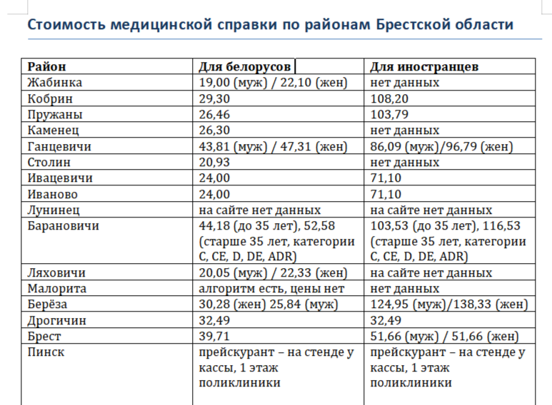 - Медицинская справка – в среднем по Брестской области она стоит около 35 рублей. Где-то дешевле, где-то дороже – зависит от района.