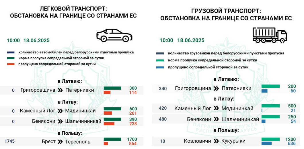 Самым медленным остаётся пункт Мядининкай (Каменный Лог). Из 500 фур в ЕС оформили всего 21 фуру. Темп такой, будто таможенники разгадывают кроссворды перед каждым оформлением. У Шальчининкая (Бенякони) дела чуть бодрее: за сутки прошли 54 грузовика, в очереди – 480 фур.