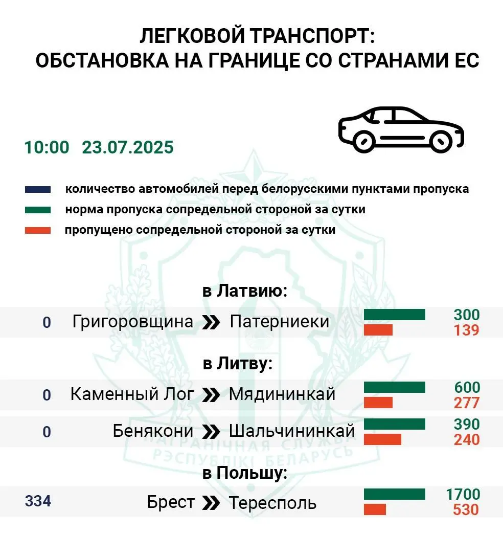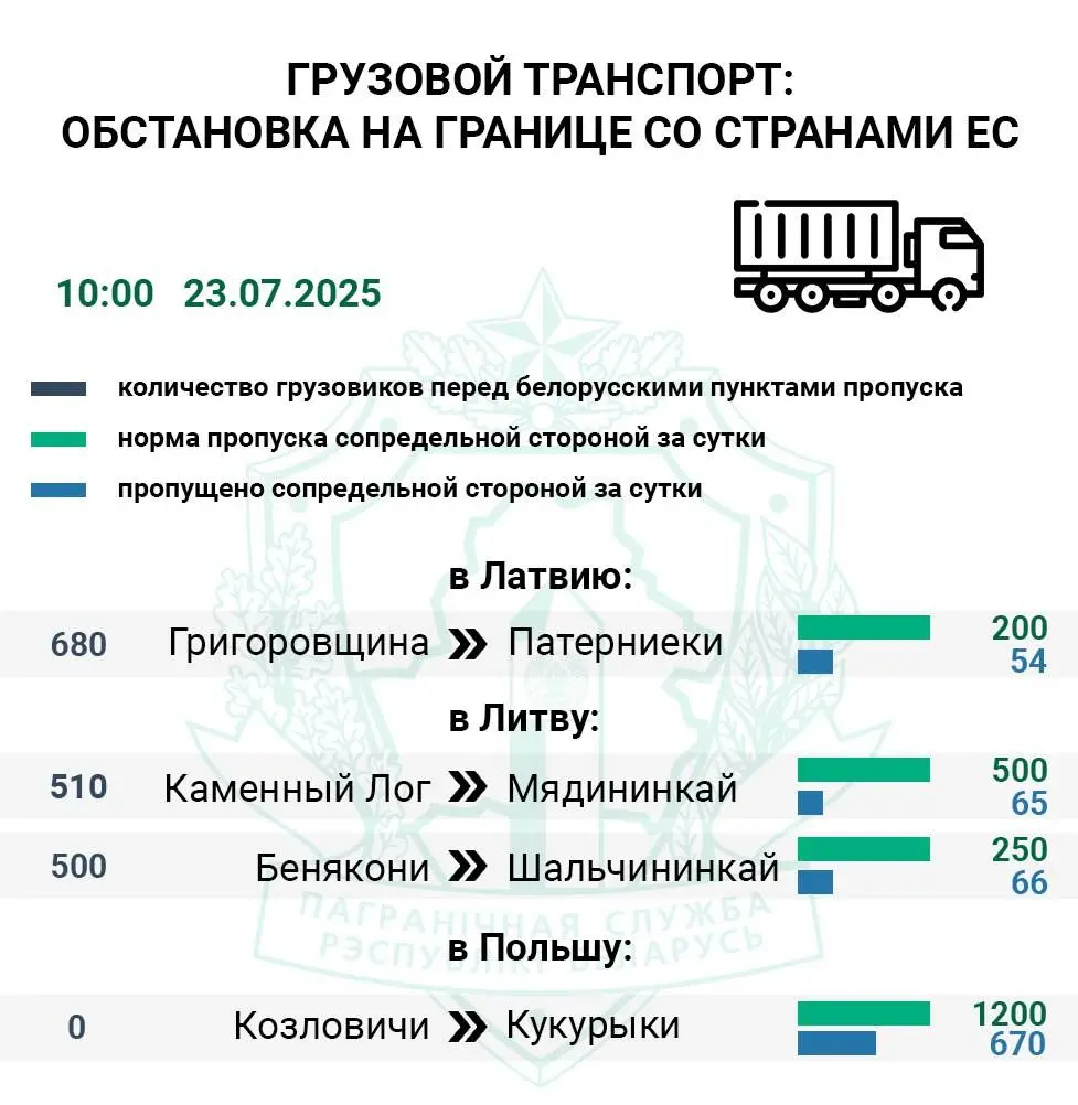 Во вторник, 22 июля, фур на границе было больше, чем терпения у водителей – свыше 1700 машин. Каменный Лог – Мядининкай за двое суток оформил всего 7% от плановой нормы, превратившись в символ транспортного ступора. Сегодняшние 13% уже кажутся прорывом, хотя на деле – всё тот же стоп-кадр, только с другим углом съёмки. Улучшений нет, просто дно вчерашнего дня оказалось чуть глубже, чем мы думали.