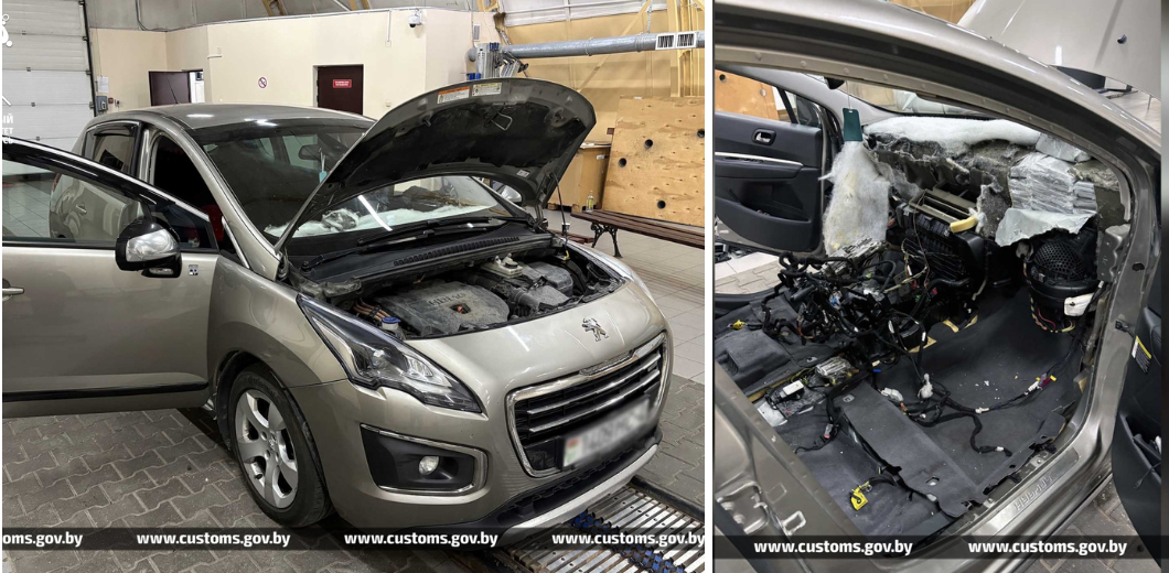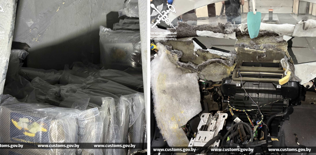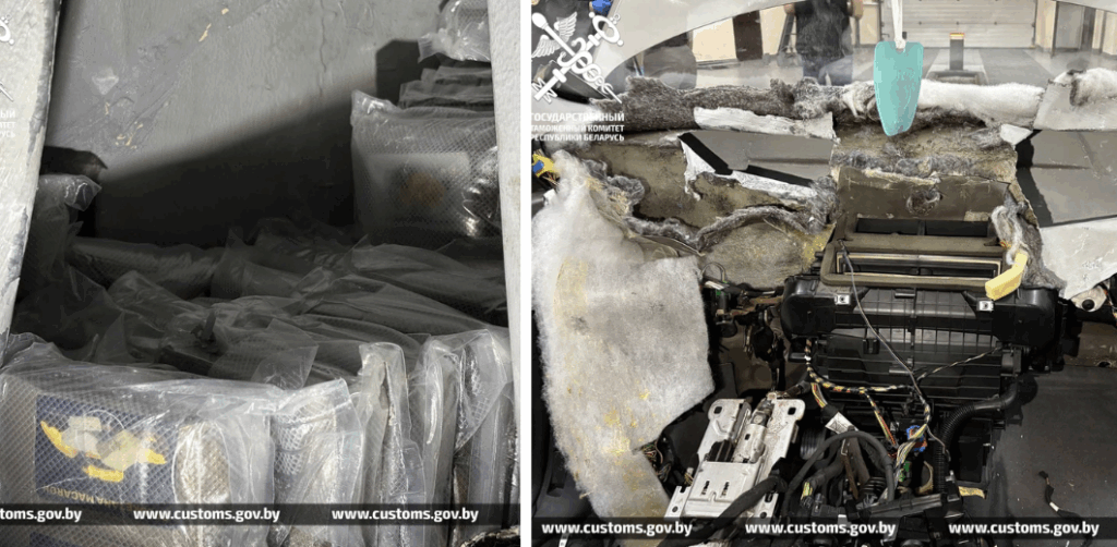 Схроны с десятками брикетов гашиша в обшивке авто и разобранная внутренняя часть передней панели автомобиля.