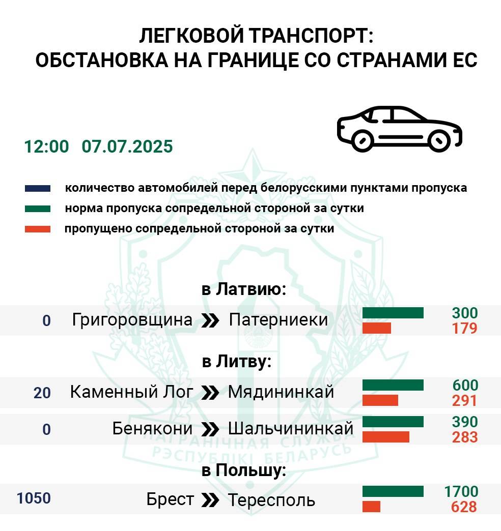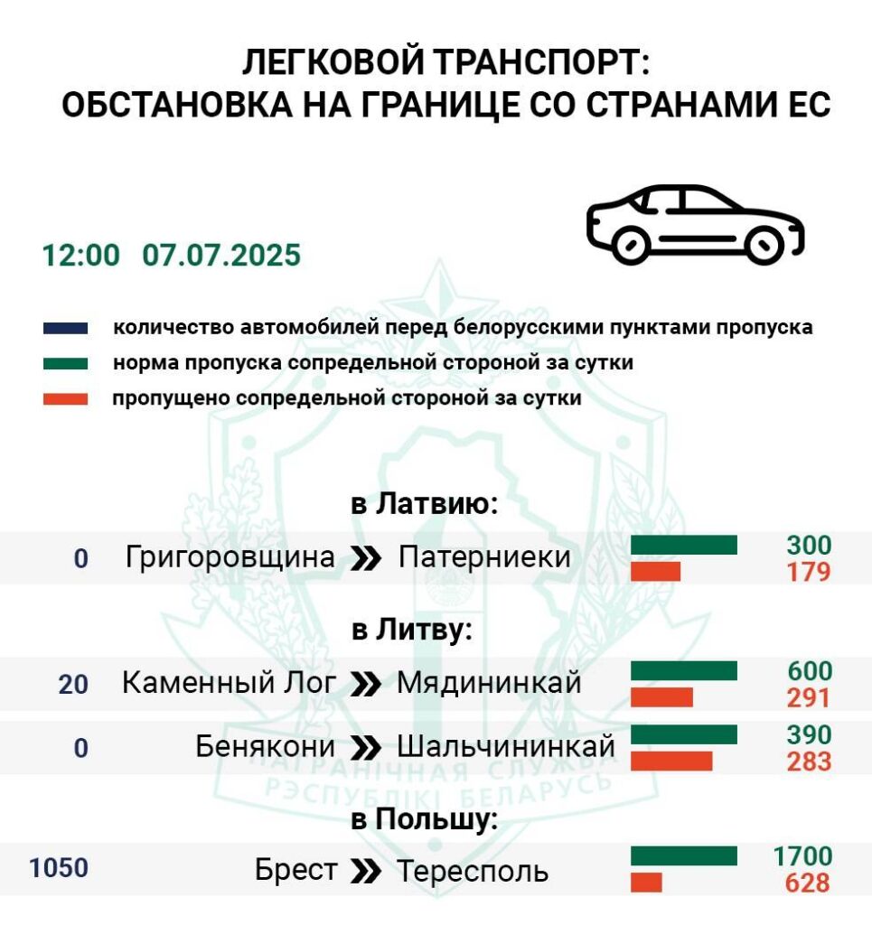 Ситуация для легковых авто на границе Беларуси и ЕС утром 7 июля