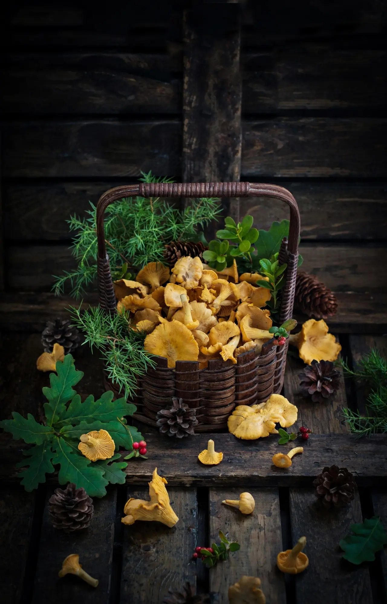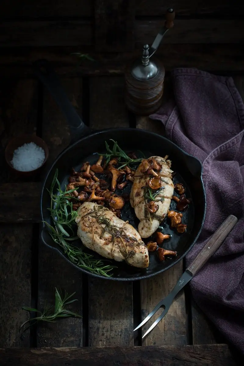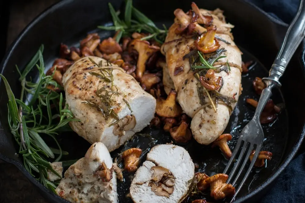 Готовые лисички распределить по филе, свернуть филе рулетом, сверху положить веточку розмарина и закрепить кулинарной нитью или деревянными шпажками.