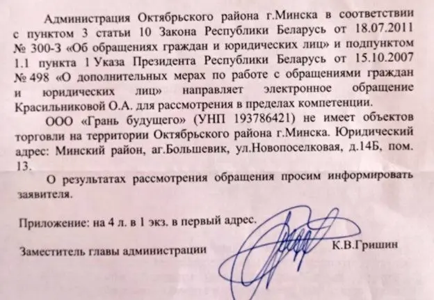 Но получив ответ из администрации Октябрьского района г. Минска причина выяснилась – фирма в третий раз за неполный год сменила юридический адрес. Уехала в агрогородок…