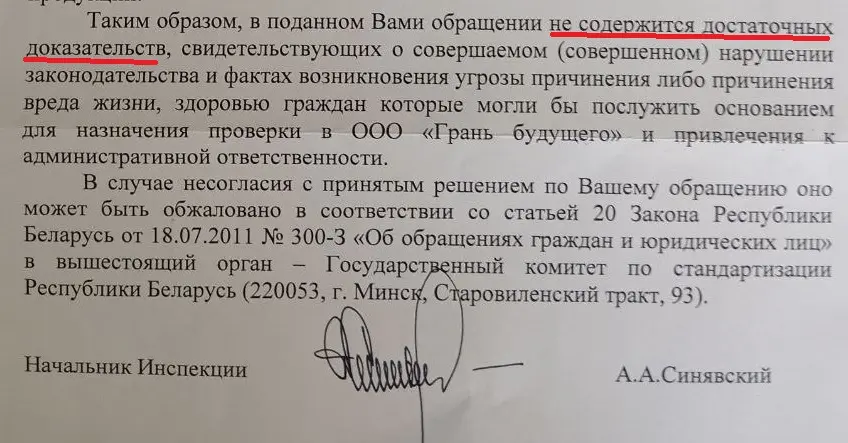 В ответе Госстандарта написано: «в поданном обращении не содержится достаточных доказательств нарушения законодательства», поэтому оснований для проверки ООО «Грань будущего» и привлечения к ответственности они не нашли.