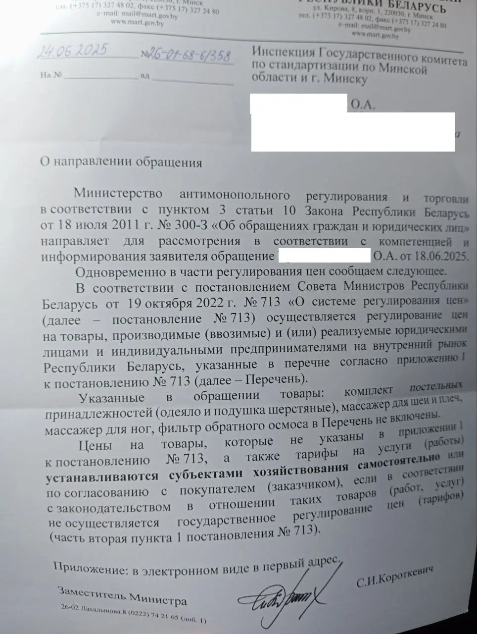 Ответ начинался: «Рассмотрев Ваше обращение, сообщаем, что регулирование цен осуществляется в соответствии с Постановлением Совета Министров №713…». Мол, продавец сам устанавливает цены или по согласованием с покупателем.