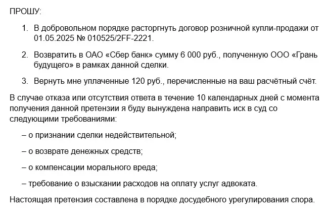 Тогда Оксана направила официальную претензию о досудебном урегулировании, где подробно расписала все несоответствия и потребовала расторгнуть договор и вернуть деньги.