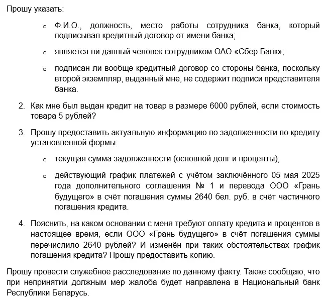 Отдельная глава истории – кредитный договор с ОАО «Сбер Банк». На 6 000 рублей был оформлен кредит, хотя в актах указано, что товар стоит 5 рублей. Более того, договор подписан не сотрудником банка, что прямо противоречит Инструкции НБ РБ №488.