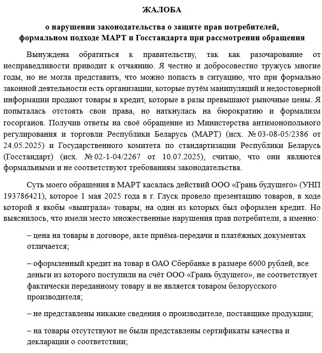 Вместо рассмотрения по существу МАРТ ограничилось общей ссылкой на нормы законодательства, не затребовало документы у продавца и уклонилось от оценки самого факта нарушения прав потребителя, предусмотренного статьями 5 и 7 Закона «О защите прав потребителей».
