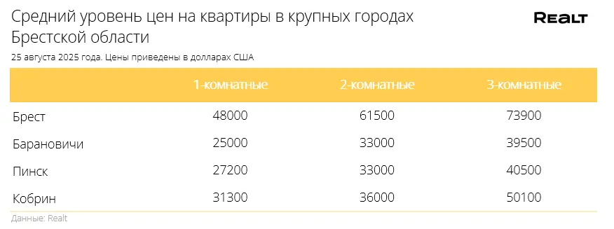 С 18 по 25 августа 2025 года средняя цена квартир в Бресте выросла на 0,5% и составила 1103 $ за квадратный метр. При этом число квартир в продаже сократилось на 0,3%. Как отмечают на сайте Realt.by, за месяц цены в городе почти не изменились – минус 0,1%.