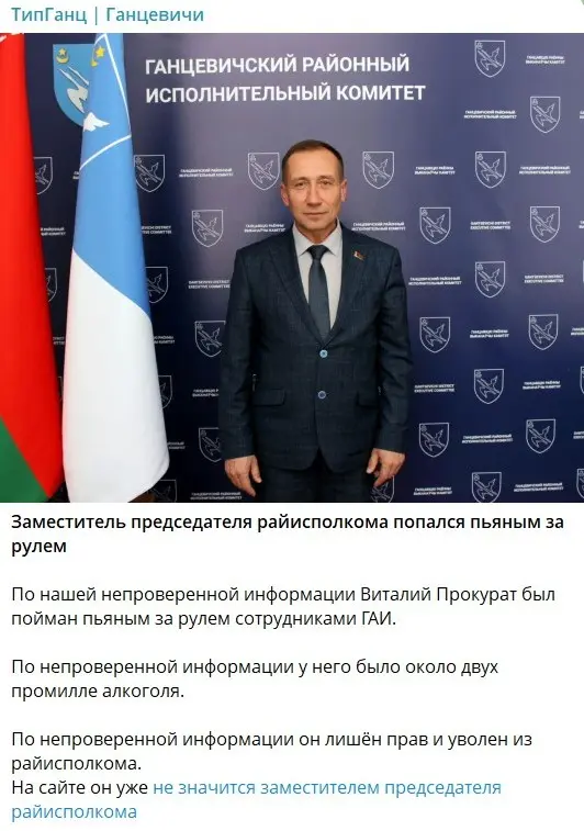 Виталий Прокурат, который руководил и курировал строительство, дорожное хозяйство, ЖКХ и транспорт со связью в Ганцевичском районе, лишился кресла зампреда и водительских прав. Из неофициальных источников просочилось, что алкотестер показал около двух промилле алкоголя.