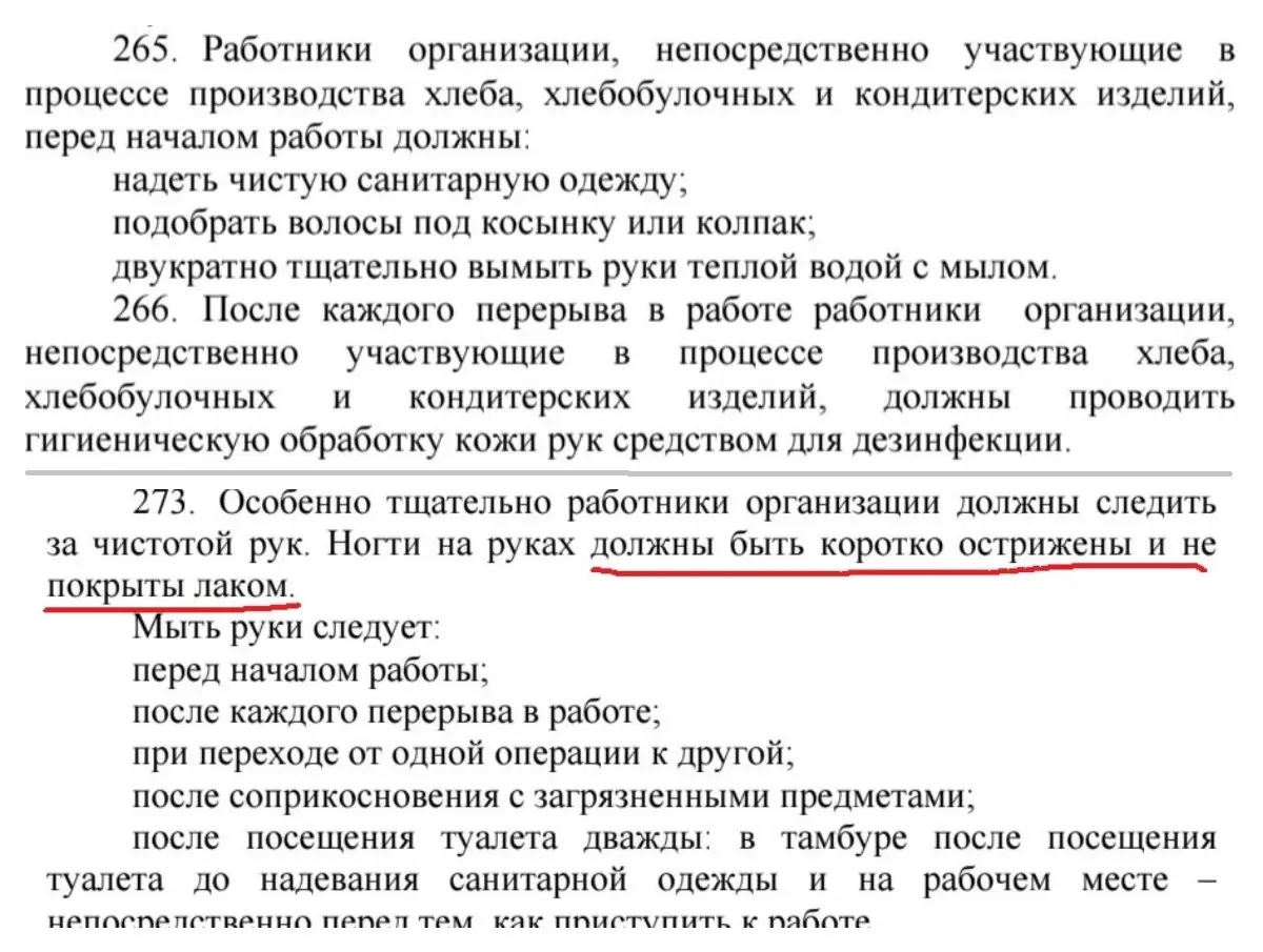 А можно ли вообще пекарям хлеба быть с накладными ногтями? Оказывается, Санпин это запрещает. Вот выдержки: