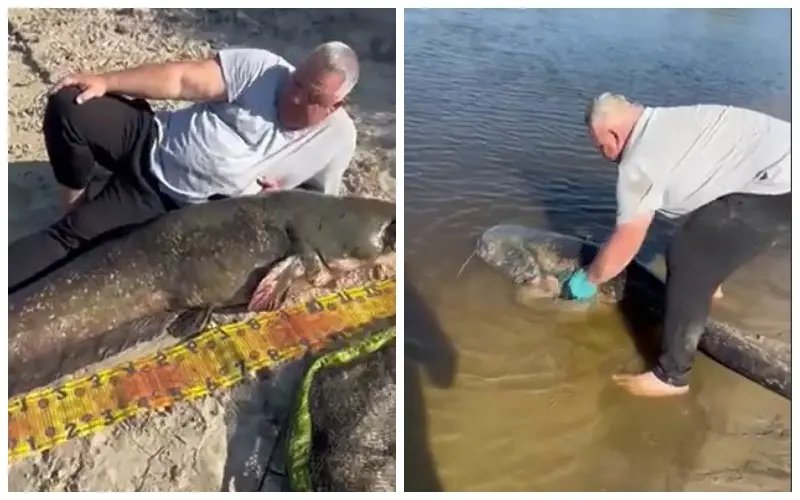 Александр Свиридов не первый раз ловит сомов, но такого большого не было, это его личный рекорд. Ранее ему попадался 54-килограммовый сом.