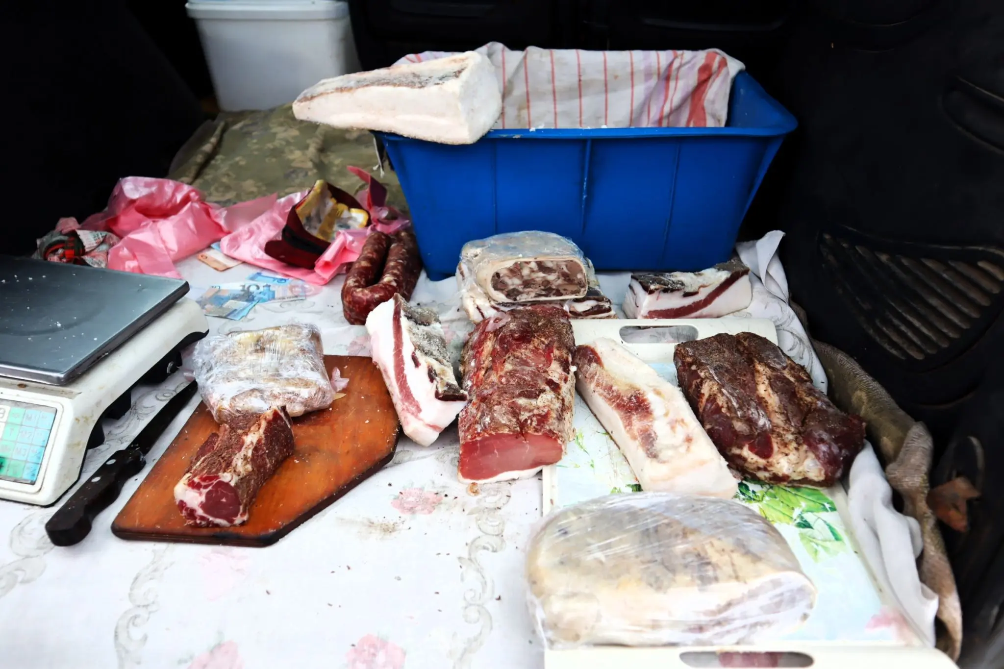 Любителям мясного предлагали сало (22 рубля), колбасы и шейку (25 рублей), мясной рулет (20 рублей) и зельц (10 рублей). Всё домашнее, из Воложинского района.