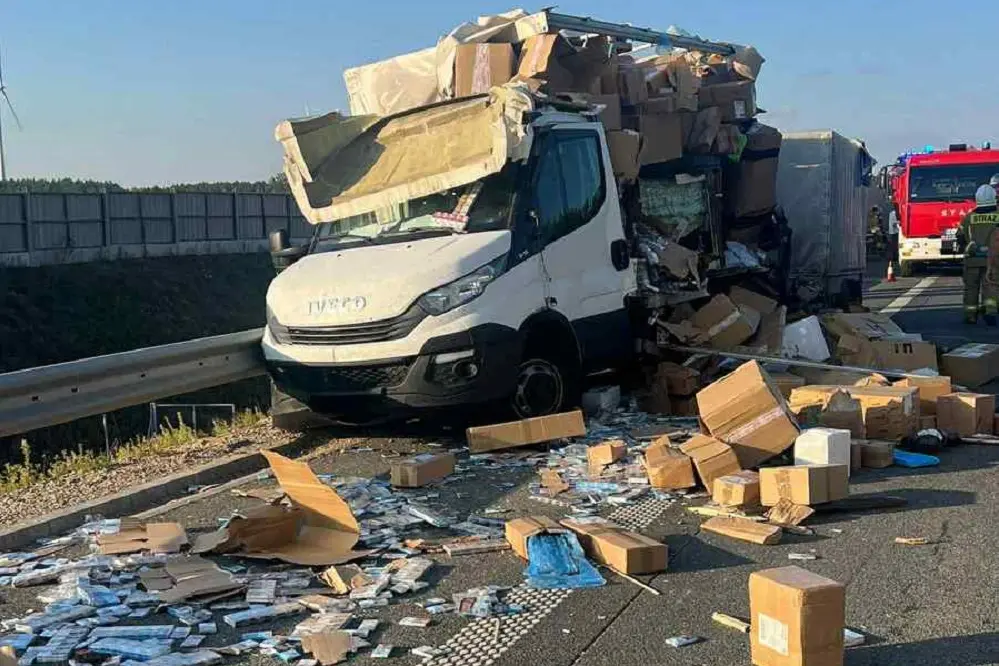 Из автомобиля, в который врезался другой водитель, высыпались сигареты. Помимо частей поврежденных автомобилей, на дороге лежали тысячи пачек сигарет без польских акцизных марок. Сотрудники полиции изъяли более 1 миллиона сигарет.