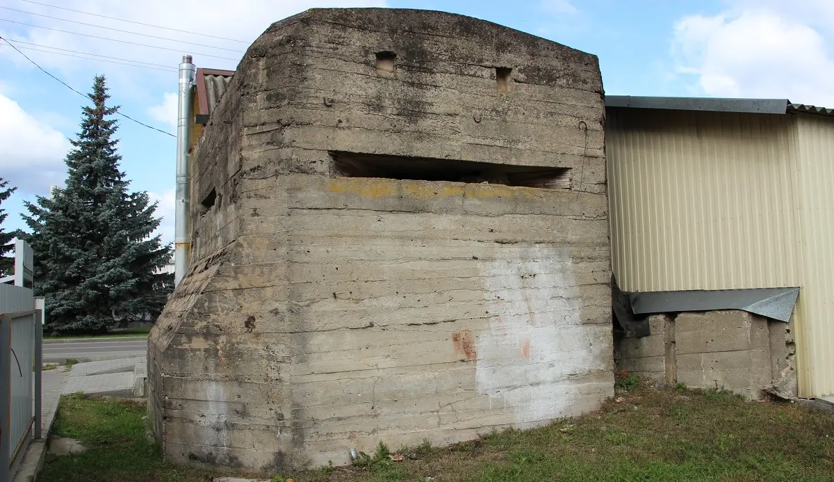 А в центре этого городского поселка вы без труда найдёте отлично сохранившийся дот или бункер. К нему с одной стороны буквально прилепился частный магазинчик. Тем не менее, внутрь дота открыт вход, при наличии фонарика можно зайти, осмотреть его устройство, оценить толстенные армированные стены и амбразуры, направленные в разные стороны.