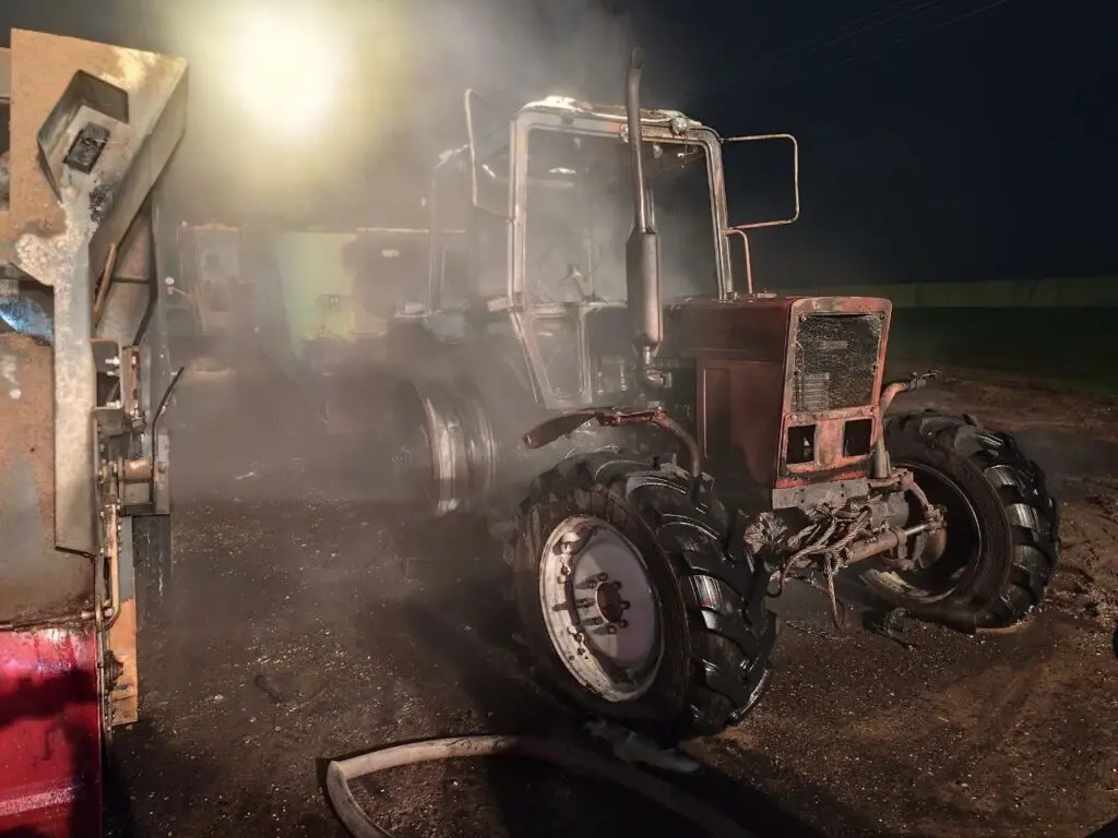 Трактор полностью уничтожен, повреждено лакокрасочное покрытие прицепа-кормораздатчика «СРК-14В», 2021 г. в. и прицепа-кормораздатчика «СРК-12Ф», 2023 г. в. Пострадавших нет.
