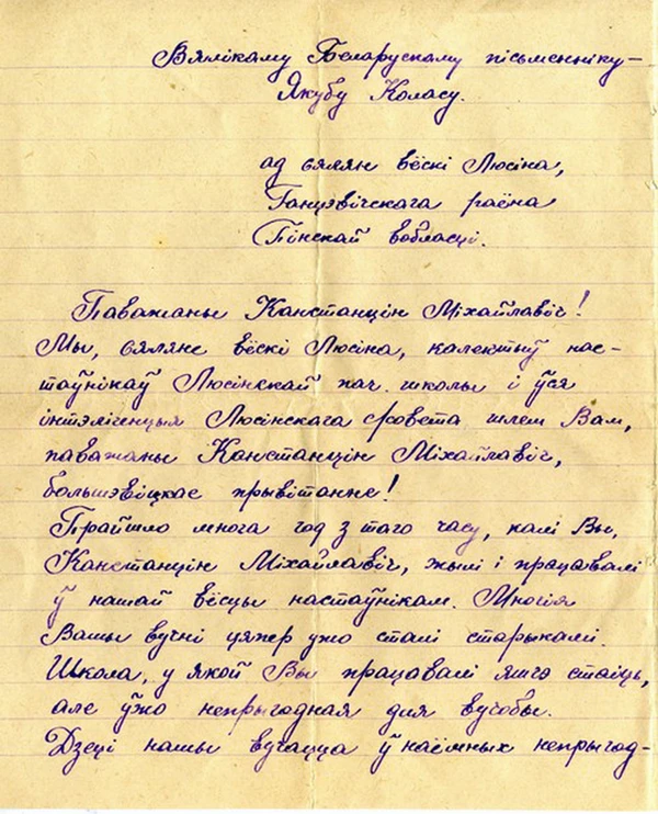У пісьме – просьба жыхароў палескай вёскі Люсіна Ганцавіцкага раёна Брэсцкай вобласці да Якуба Коласа дапамагчы з будаўніцтвам школы. Сам факт звароту выглядае сёння амаль фантастычна: вяскоўцы не ідуць адразу ў райвыканкам ці аблвыканкам, а пішуць народнаму паэту.