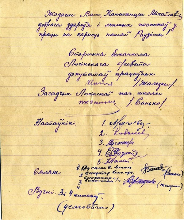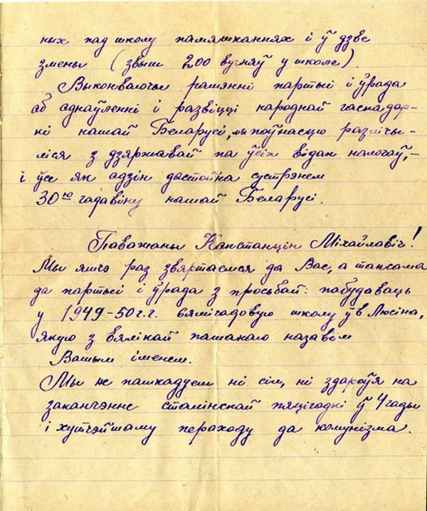 У кароткім пасланні вяскоўцы просяць дапамагчы ім у вельмі канкрэтнай і жыццёвай справе… Пісалі, відаць, доўга, старанна, ад рукі і з надзеяй. І  гэты ліст падтверджанне таго, што вядомыя людзі творчасці на той час мелі рэальны ўплыў і маглі вырашаць сур’ёзныя праблемы. Бо партыйныя чыноўнікі, гэтак як і цяперашнія, ніяк не змяніліся – ад іх звычайна прыходзілі фармальныя адпіскі.