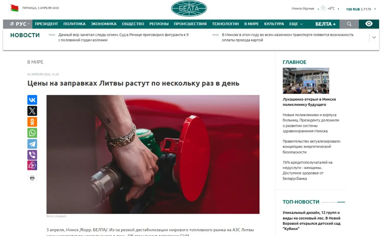 В ряде публикаций, в том числе со ссылкой на БЕЛТА и региональные СМИ ( zarya.by), говорится, что в Литве из-за дестабилизации рынка цены на топливо могут меняться по нескольку раз в день, а власти рассматривают запрет на частое изменение цен.